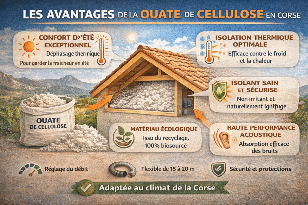 Grâce à ses propriétés isolantes exceptionnelles, la ouate de cellulose permet de réduire les pertes de chaleur en hiver et de limiter la surchauffe en été, ce qui en fait un isolant particulièrement adapté au climat méditerranéen corse.